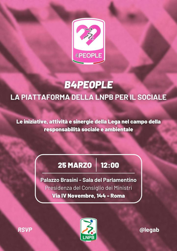 Mercoledì 25 marzo alle ore 12 presso Palazzo Brasini, Sala del Parlamentino, in via IV Novembre 144 a Roma si terrà una conferenza stampa di presentazione delle iniziative, delle attività e delle sinergie della Lega Serie B nel campo della responsabilità sociale attraverso la nuova piattaforma ‘B4People’.